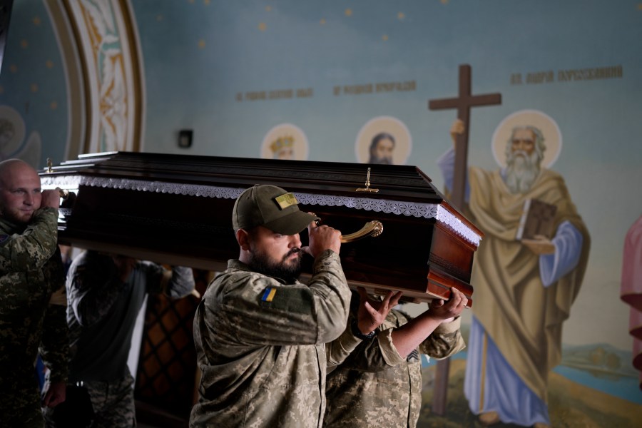 In Kyiv. the bells of St. Michael’s cathedral tolled as four soldiers carried Ratushnyi’s coffin to the memorial service Saturday morning, held outdoors in the church’s sunlit courtyard. Poppies and a traditional loaf of bread were placed on the coffin covered with Ukraine’s blue and yellow flag.