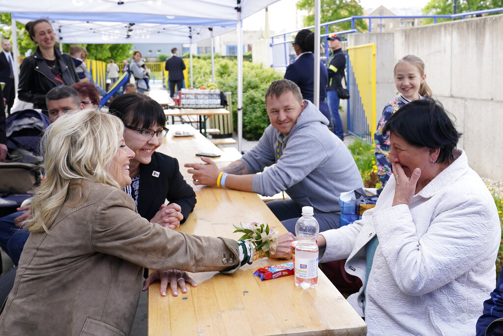 First lady Jill Biden visits with Ukrainian refugees at a city-run refugee center in Kosice, Slovakia, Sunday, May 8, 2022. The center is a place for Ukrainian refugees to rest and prepare for onward travel. Biden will then travel to the Slovak border with Ukraine to meet with refugees. (AP Photo/Susan Walsh, Pool)