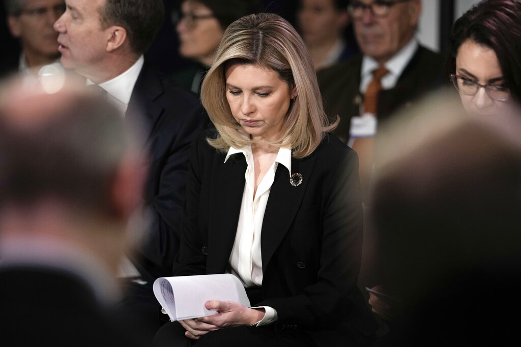 First Lady of Ukraine Olena Zelenska is pictured during a minute of silence at the World Economic Forum in Davos, Switzerland, for the victims of a helicopter crash in Ukraine, where Minister of Internal Affairs Denys Monastyrsky died among others on Wednesday, Jan. 18, 2023. The annual meeting of the World Economic Forum is taking place in Davos from Jan. 16 until Jan. 20, 2023. (AP Photo/Markus Schreiber)