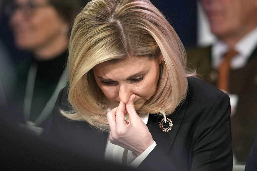 First Lady of Ukraine Olena Zelenska reacts at the World Economic Forum in Davos, Switzerland after the news of a helicopter crash in Ukraine, where Minister of Internal Affairs Denys Monastyrsky died among others on Wednesday, Jan. 18, 2023. The annual meeting of the World Economic Forum is taking place in Davos from Jan. 16 until Jan. 20, 2023. (AP Photo/Markus Schreiber)