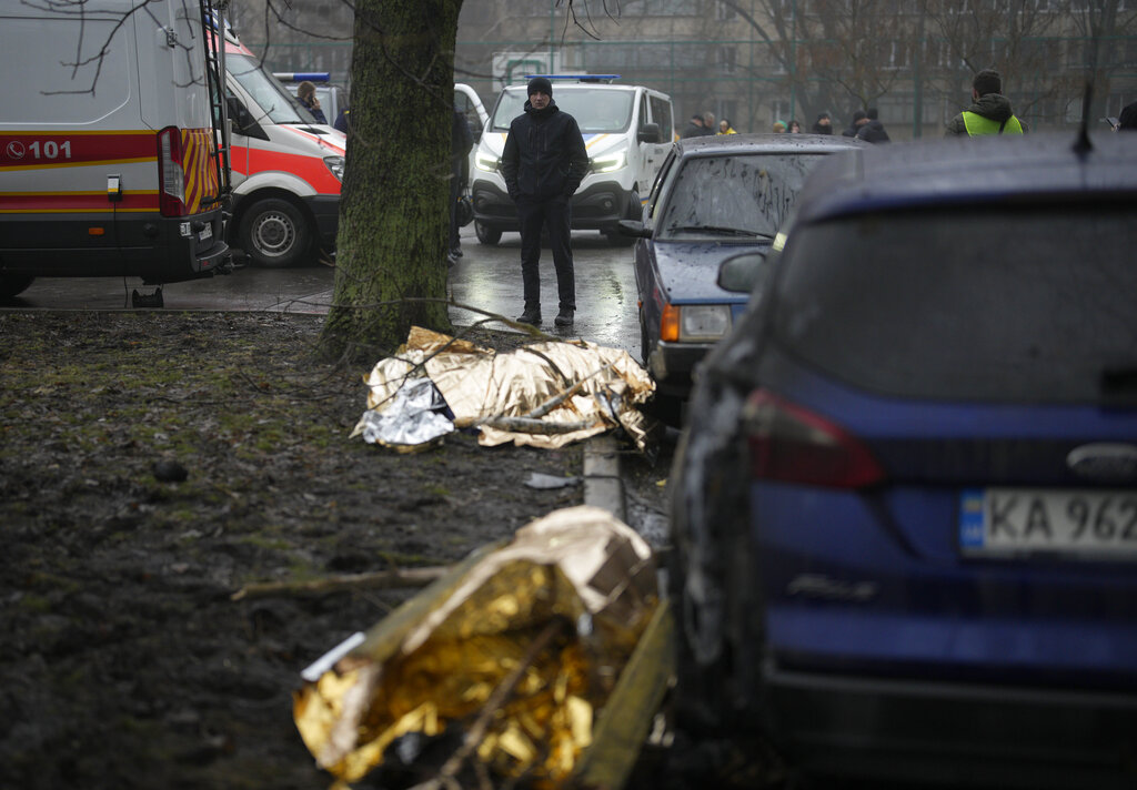 Dead bodies lay on the ground at the scene where a helicopter crashed on civil infrastructure in Brovary, on the outskirts of Kyiv, Ukraine, Wednesday, Jan. 18, 2023. The chief of Ukraine’s National Police says a helicopter crash in a Kyiv suburb has killed 16 people, including Ukraine’s interior minister and two children. He said nine of those killed were aboard the emergency services helicopter. (AP Photo/Daniel Cole)