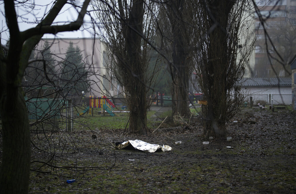 A dead body on the ground at the scene where a helicopter crashed on civil infrastructure in Brovary, on the outskirts of Kyiv, Ukraine, Wednesday, Jan. 18, 2023. The chief of Ukraine’s National Police says a helicopter crash in a Kyiv suburb has killed 16 people, including Ukraine’s interior minister and two children. He said nine of those killed were aboard the emergency services helicopter. (AP Photo/Daniel Cole)