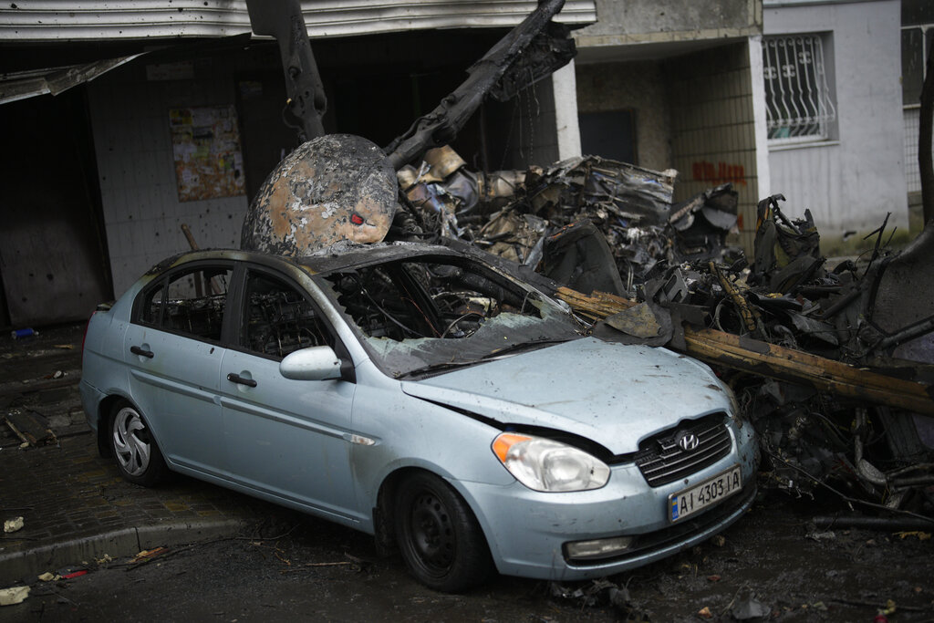 A view of the scene where a helicopter crashed on civil infrastructure in Brovary, on the outskirts of Kyiv, Ukraine, Wednesday, Jan. 18, 2023. The chief of Ukraine’s National Police says a helicopter crash in a Kyiv suburb has killed 16 people, including Ukraine’s interior minister and two children. He said nine of those killed were aboard the emergency services helicopter. (AP Photo/Daniel Cole)