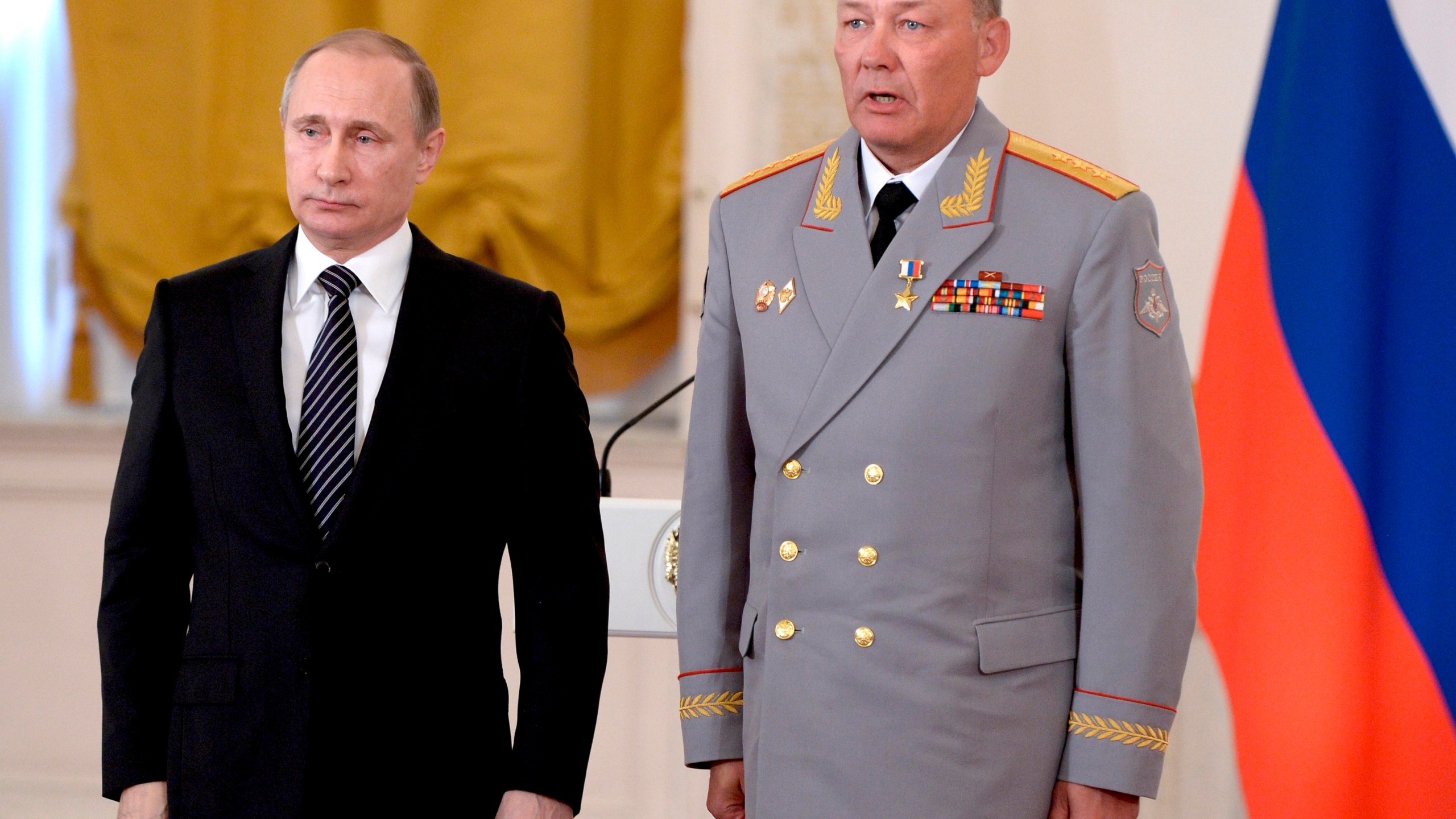 In this photo taken on March 17, 2016, Russian President Vladimir Putin, left, poses with Col. Gen. Alexander Dvornikov during an awarding ceremony in Moscow’s Kremlin, Russia. Russia has appointed a new Ukraine war commander. A top U.S. official on Sunday, April 10, 2022 said Russia named Gen. Dvornikov as commander of an armed campaign that Russian authorities still refer to as a “special military operation.” (Alexei Nikolsky/Sputnik, Kremlin Pool Photo via AP)