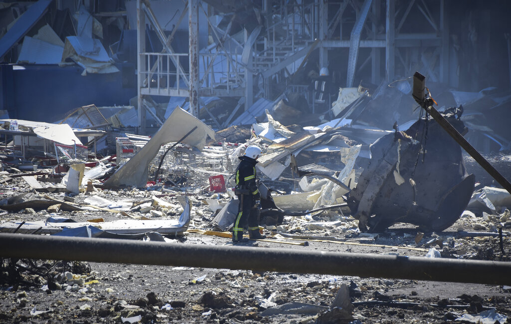 The Ukrainian military said Tuesday that Russian forces fired seven missiles a day earlier from the air at the crucial Black Sea port of Odesa, hitting a shopping center and a warehouse. One person was killed and five were wounded, the military said.