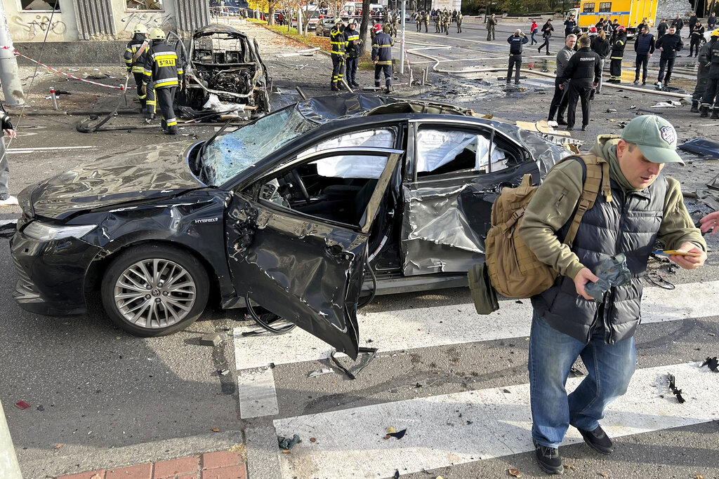 Damaged cars and buildings seen at the scene of Russian shelling in Kyiv, Ukraine, Monday, Oct. 10, 2022. Multiple explosions rocked Kyiv early Monday following months of relative calm in the Ukrainian capital. Kyiv Mayor Vitali Klitschko reported explosions in the city’s Shevchenko district, a large area in the center of Kyiv that includes the historic old town as well as several government offices. (AP Photo/Efrem Lukatsky)