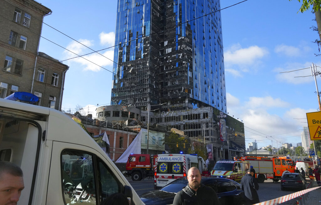 A damaged tower block at the scene of Russian shelling in Kyiv, Ukraine, Monday, Oct. 10, 2022. Two explosions rocked Kyiv early Monday following months of relative calm in the Ukrainian capital. (AP Photo/Efrem Lukatsky)