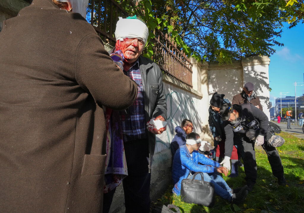 People receive medical treatment at the scene of Russian shelling, in Kyiv, Ukraine, Monday, Oct. 10, 2022. Multiple explosions rocked Kyiv early Monday following months of relative calm in the Ukrainian capital. Kyiv Mayor Vitali Klitschko reported explosions in the city’s Shevchenko district, a large area in the center of Kyiv that includes the historic old town as well as several government offices. (AP Photo/Efrem Lukatsky)