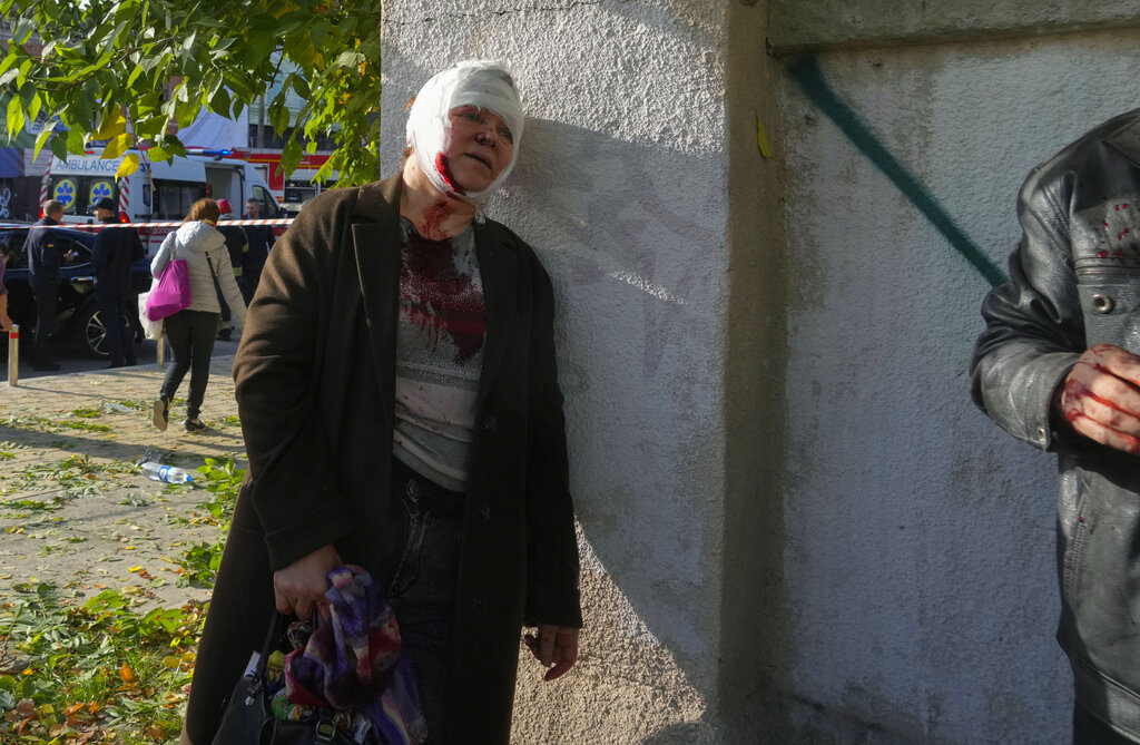 An injured woman reacts after Russian shelling, in Kyiv, Ukraine, Monday, Oct. 10, 2022. Two explosions rocked Kyiv early Monday following months of relative calm in the Ukrainian capital. (AP Photo/Efrem Lukatsky)