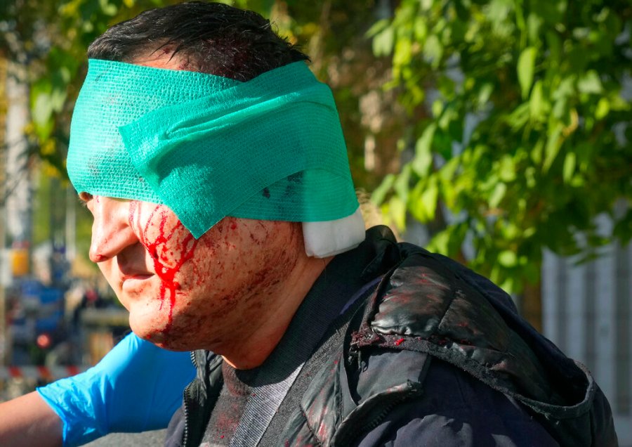 An injured man receives medical treatment at the scene of Russian shelling, in Kyiv, Ukraine, Monday, Oct. 10, 2022. Multiple explosions rocked Kyiv early Monday following months of relative calm in the Ukrainian capital. Kyiv Mayor Vitali Klitschko reported explosions in the city’s Shevchenko district, a large area in the center of Kyiv that includes the historic old town as well as several government offices. (AP Photo/Efrem Lukatsky)