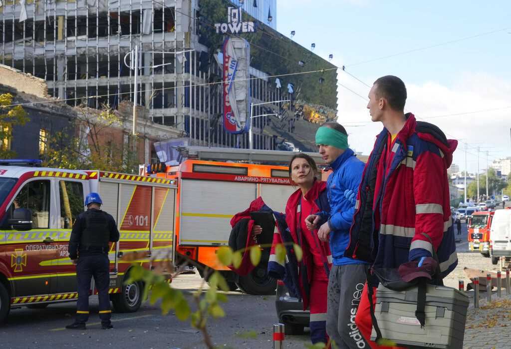 Rescue workers survey the scene of a Russian attack on Kyiv, Ukraine on Monday, Oct. 10, 2022. Two explosions rocked Kyiv early Monday following months of relative calm in the Ukrainian capital. (AP Photo/Adam Schreck)