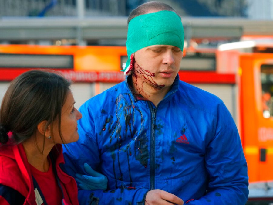 Residents were seen on the streets with blood on their clothes and hands. A young man wearing a blue jacket sat on the ground as a medic wrapped a bandage around his head. A woman with bandages wrapped around her head had blood all over the front of her blouse. Several cars were also damaged or completely destroyed. Air raid sirens sounded repeatedly across the country and in Kyiv.