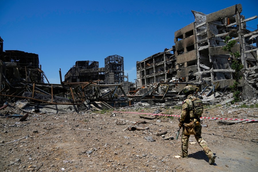 FILE – A Russian soldier walks in front of the damaged Metallurgical Combine Azovstal plant, in Mariupol, on the territory which is under the Government of the Donetsk People’s Republic control, eastern Ukraine, June 13, 2022. Six months ago, Russian President Vladimir Putin sent troops into Ukraine in an unprovoked act of aggression, starting the largest military conflict in Europe since World War II. Putin expected a quick victory but it has turned into a grinding war of attrition. Russian offensive are largely stuck as Ukrainian forces increasingly target key facilities far behind the front lines. (AP Photo/File)