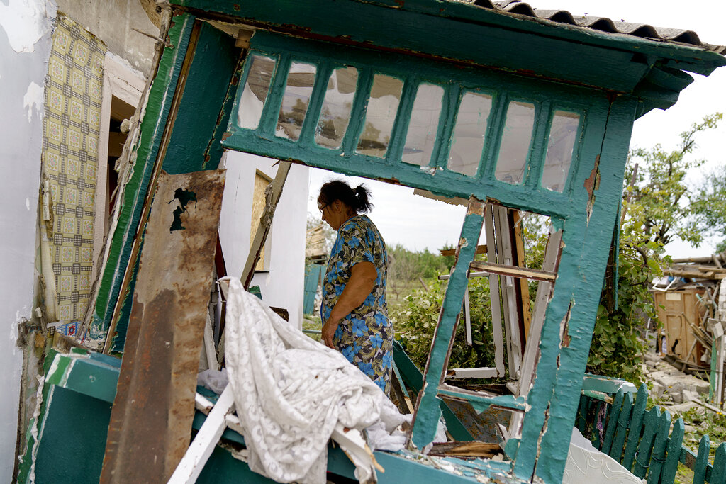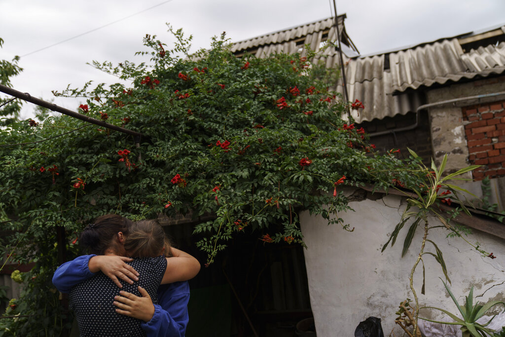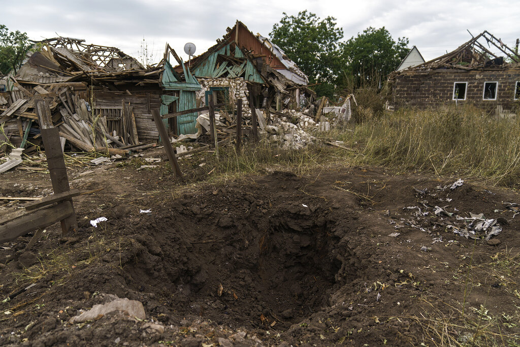 A crater from a Russian rocket attack is seen next to damaged homes in Kramatorsk, Donetsk region, eastern Ukraine, Saturday, Aug. 13, 2022. (AP Photo/David Goldman)