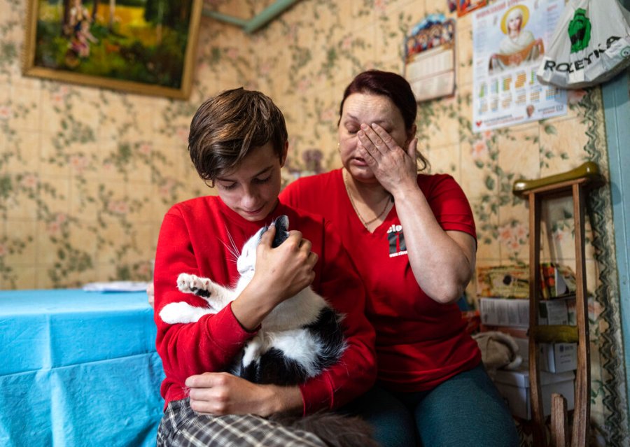 Danyk lives with his mother and grandmother in a house near Chernihiv, a town nearly 90 miles north of Kyiv, where a piece of tarp covers the broken bedroom windows. He sells milk from the family’s cow that grazes in the nearby fields. A handwritten sign wrapped in clear plastic on the front gate reads: “Please buy milk to help my mother who is injured.”