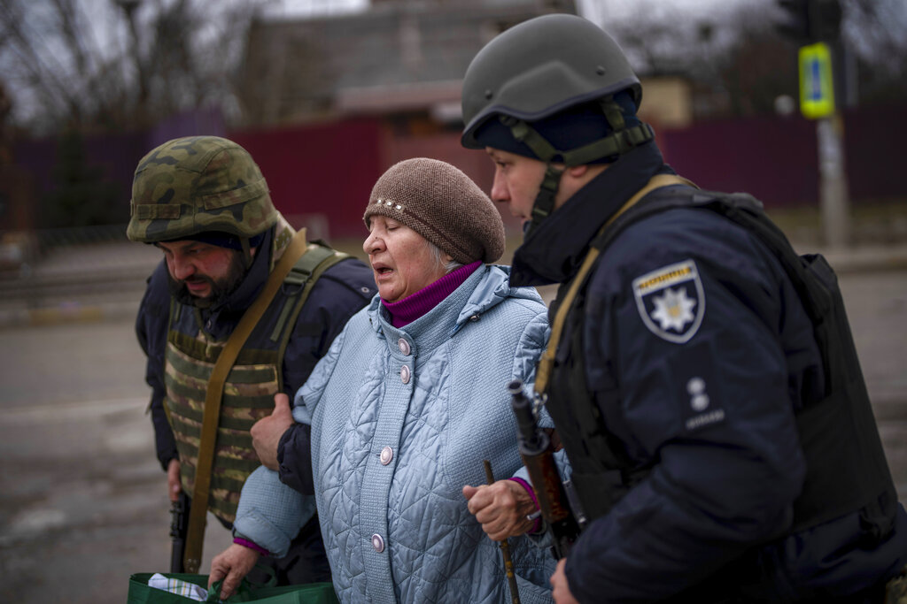 FILE – Ukrainian police officer Ruslan Huseinov, left, with his colleague help a woman fleeing as the artillery echoes nearby in Irpin, in the outskirts of Kyiv, Ukraine, March 7, 2022. Six months after Russia launched its invasion of Ukraine and with no end to the conflict in sight, The Associated Press revisited Danyk Rak, a 12-year-old looking after his wounded mother, as well as a police officer and an Orthodox priest whose lives have been upended by war. (AP Photo/Emilio Morenatti, File)