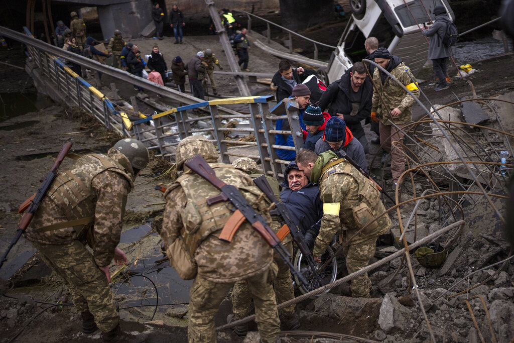FILE – Ukrainian soldiers help a man in a wheelchair as people try to flee crossing the Irpin river in the outskirts of Kyiv, Ukraine, Saturday, March 5, 2022. Six months after Russia launched its invasion of Ukraine and with no end to the conflict in sight, The Associated Press revisited Danyk Rak, a 12-year-old looking after his wounded mother, as well as a police officer and an Orthodox priest whose lives have been upended by war. (AP Photo/Emilio Morenatti, File)