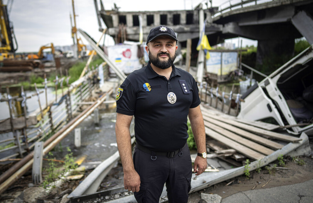 Ukrainian police officer Ruslan Huseinov stands on a destroyed bridge in the city of Irpin, on the outskirts of Kyiv, Ukraine, Tuesday, Aug. 16, 2022. The destroyed bridge to Irpin served as a crossing point for local residents who fled from the cities captured by the Russian troops in March and February. (AP Photo/Evgeniy Maloletka)