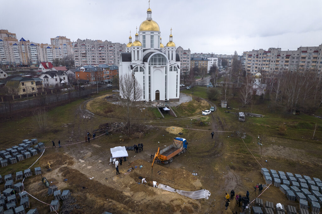 The largest mass grave in Bucha — a town outside Kyiv that has become synonymous with the brutality of the Russian attack — is behind the church.