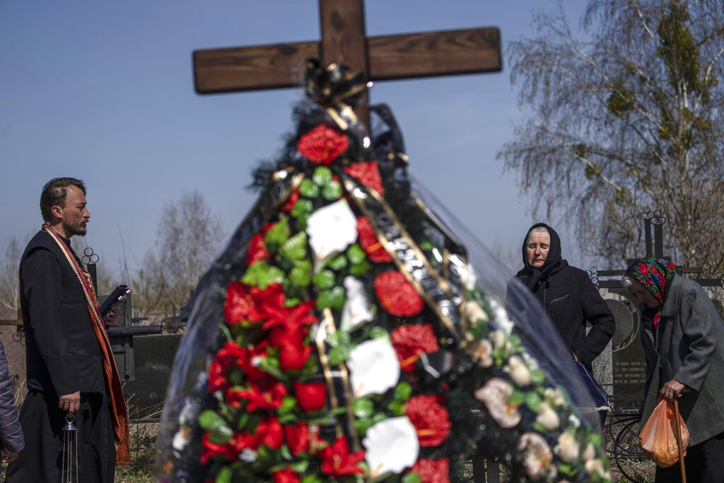 FILE – Orthodox priest Father Andriy, left, attends a funeral of local resident Anatoliy Kosyanchuk, 56, who was captured by Russian soldiers on March 29, and found dead with heavy head injuries in Bucha, in the outskirts of Kyiv, Ukraine, April 15, 2022. Six months after Russia launched its invasion of Ukraine and with no end to the conflict in sight, The Associated Press revisited Danyk Rak, a 12-year-old looking after his wounded mother, as well as a police officer and an Orthodox priest whose lives have been upended by war. (AP Photo/Rodrigo Abd, File)