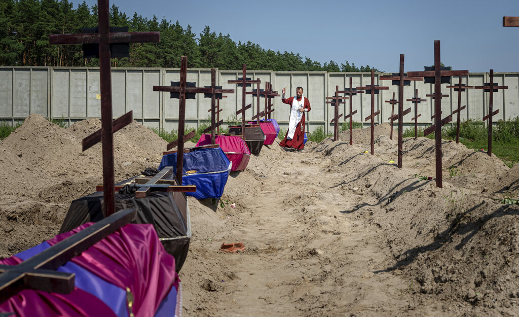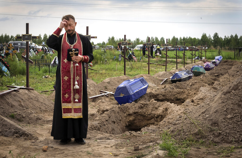 FILE – Orthodox priest Father Andriy prays for unidentified civilians killed by Russian troops during Russian occupation in Bucha, on the outskirts of Kyiv, Ukraine, Aug. 11, 2022. Six months after Russia launched its invasion of Ukraine and with no end to the conflict in sight, The Associated Press revisited Danyk Rak, a 12-year-old looking after his wounded mother, as well as a police officer and an Orthodox priest whose lives have been upended by war. (AP Photo/Efrem Lukatsky, File)