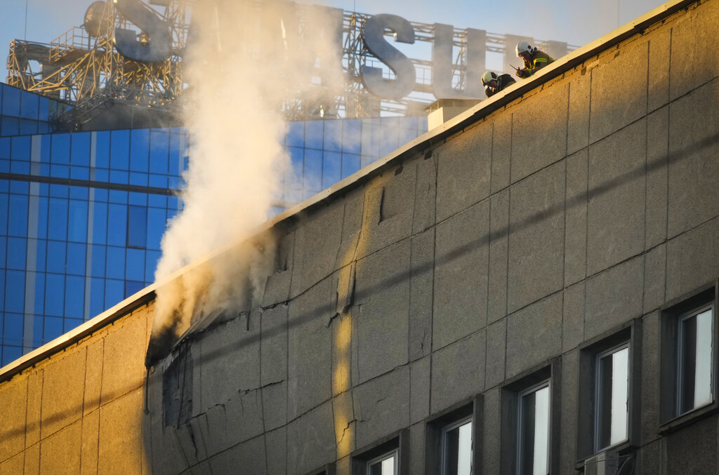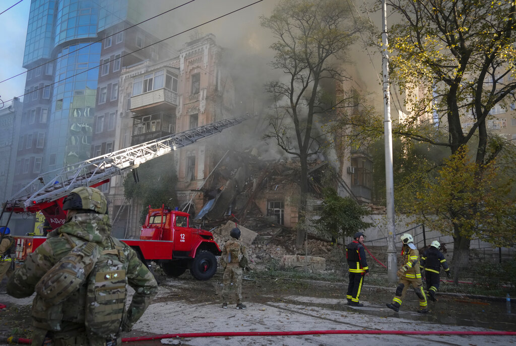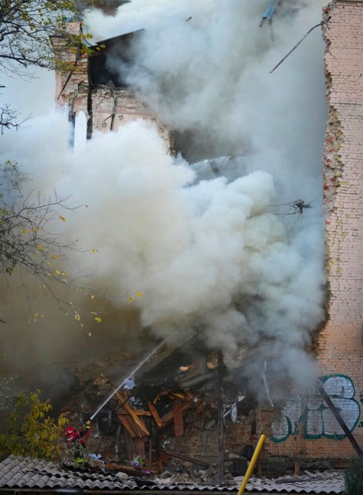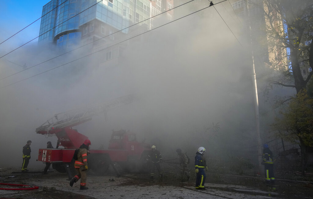 KYIV, Ukraine (AP) — Waves of explosives-laden suicide drones struck Ukraine’s capital Monday, setting buildings ablaze, tearing a hole in one of them and sending people scurrying for cover or trying to shoot them down in what the president said was Russia’s attempt to terrorize civilians.