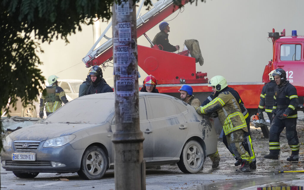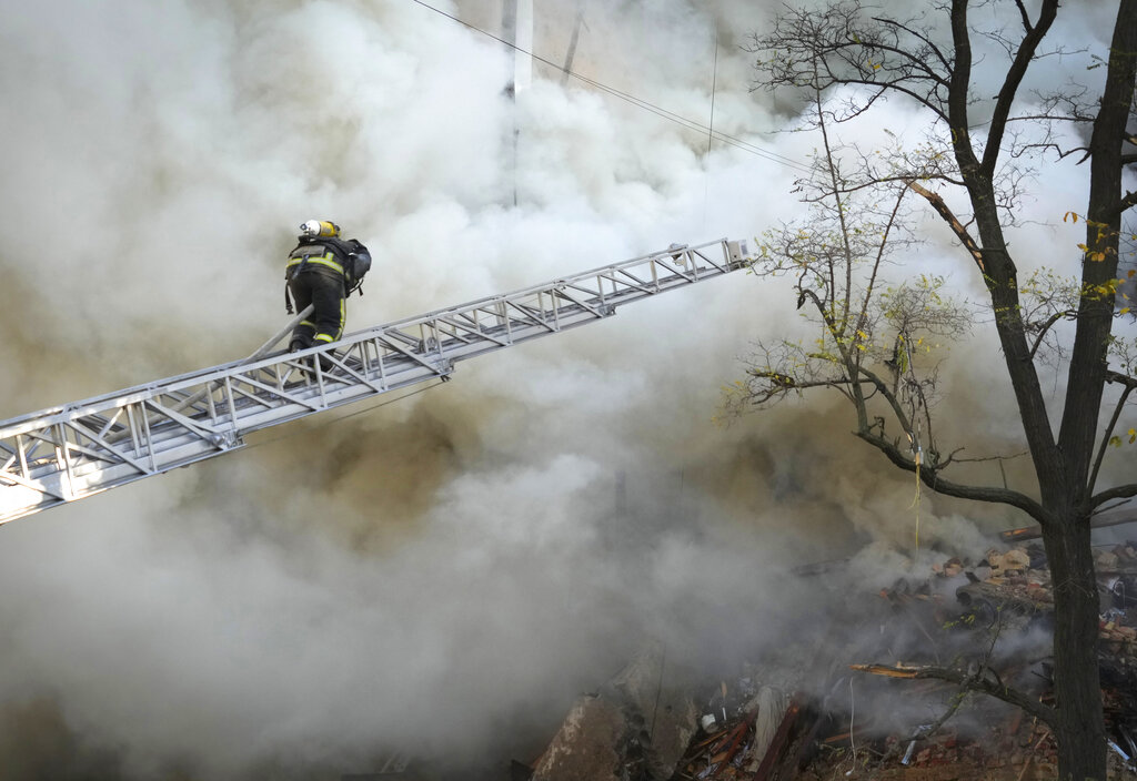 One strike appeared to target the city’s heating network, hitting an operations center. Another slammed into a four-story residential building, ripping open a gaping hole and collapsing at least three apartments. Four bodies were recovered, including those of a woman who was 6 months pregnant and her husband, Klitschko said. An older woman and another man also were killed there.