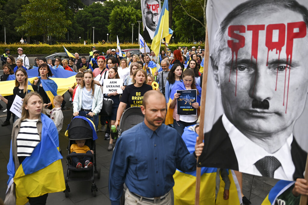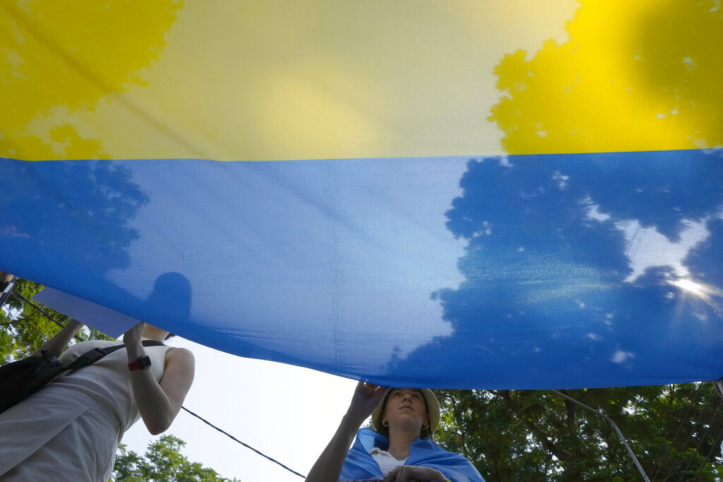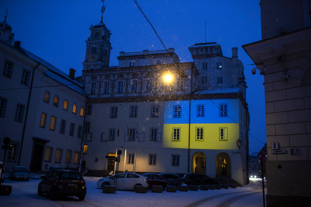 Tributes to Ukraine’s resilience flowed from overseas. The Eiffel Tower in Paris was among monuments illuminated in Ukraine’s colors — yellow and blue.