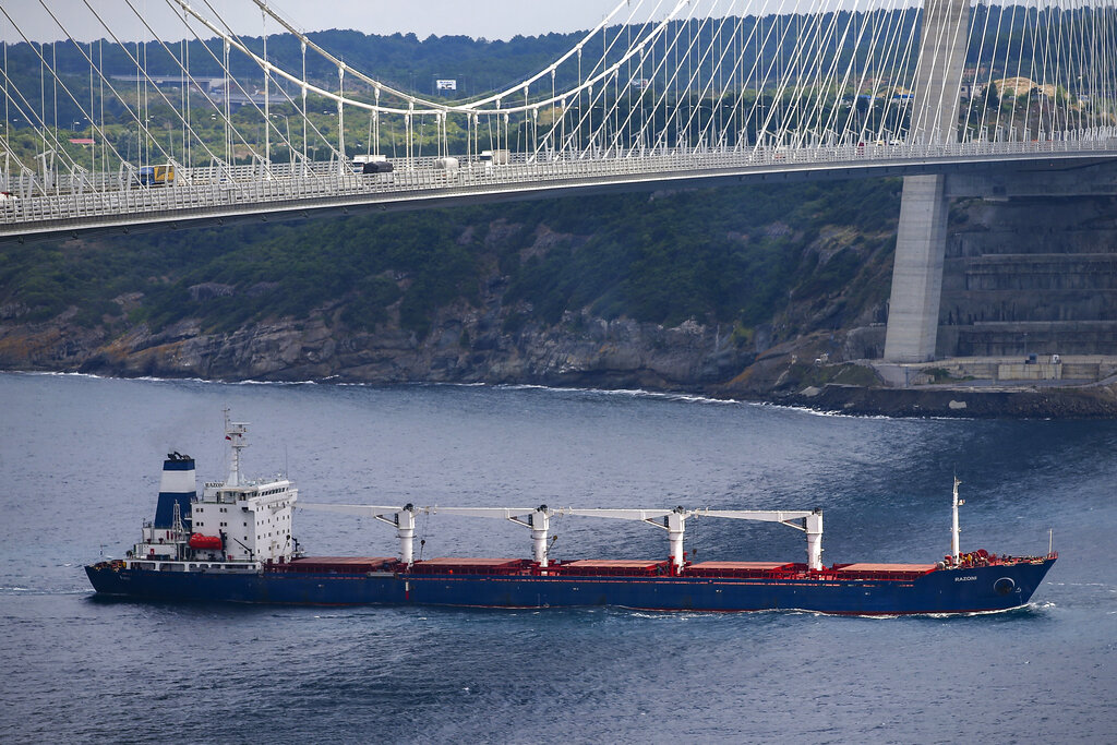 FILE – The Sierra Leone-flagged cargo ship Razoni sails under Yavuz Sultan Selim Bridge after being inspected by Russian, Ukrainian, Turkish and U.N. officials at the entrance of the Bosphorus Strait in Istanbul, Turkey, Wednesday, Aug. 3, 2022. Ukrainian President Volodymyr Zelenskyy on Thursday, Aug. 18, 2022 is set to host his Turkish counterpart and the U.N. chief for talks about the implementation of a deal to resume Ukraine grain exports, the volatile situation at a Russia-occupied nuclear power plant and diplomatic efforts to help end the war. (AP Photo/Emrah Gurel, File)