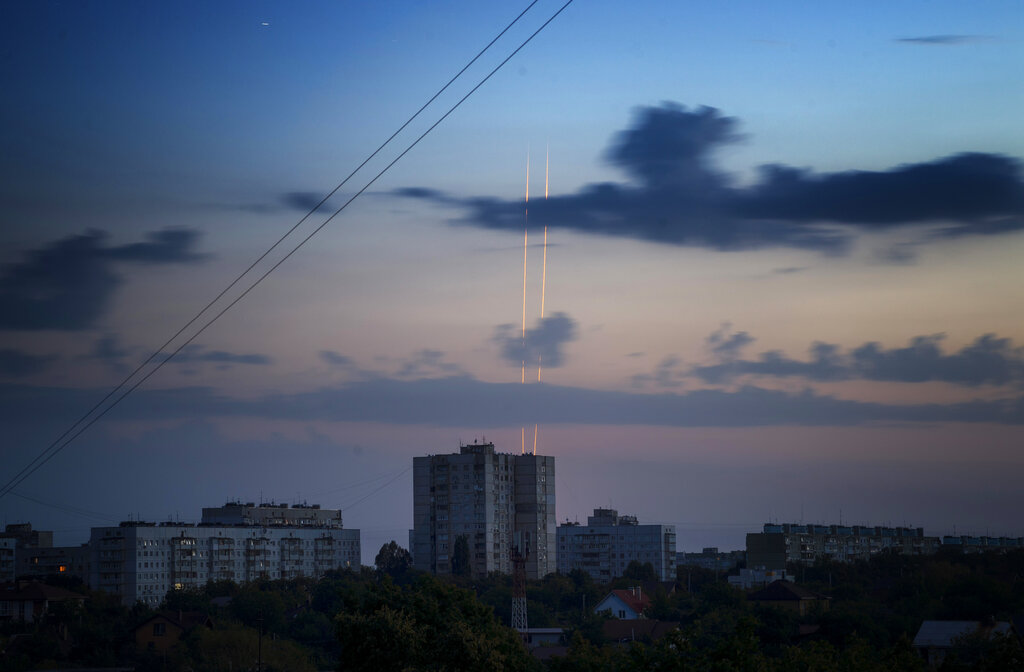 Russian rockets launch against Ukraine from Russia’s Belgorod region are seen at dawn in Kharkiv, Ukraine, early Thursday, Aug. 18, 2022. (AP Photo/Vadim Belikov)