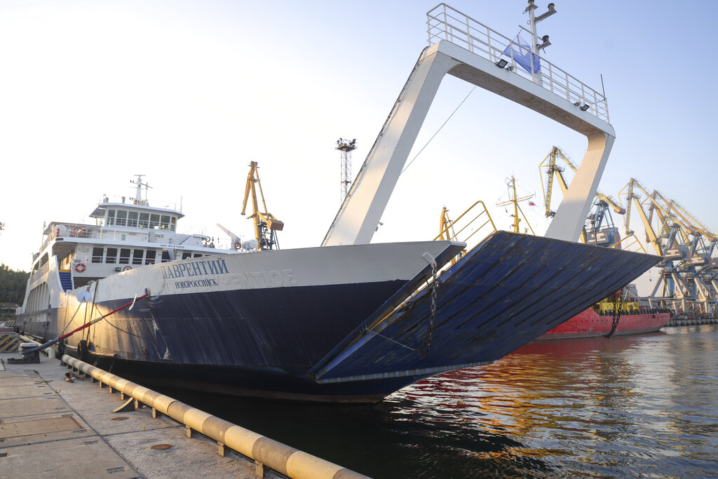 Ferry Lavrenty, arrived from Russian Yeysk, is moored in the port of Mariupol, in an area controlled by Russian-backed separatist forces, eastern Ukraine, Wednesday, Aug. 17, 2022. The ferry will start regular cargo and passenger trips from Russia to Mariupol. (AP Photo)