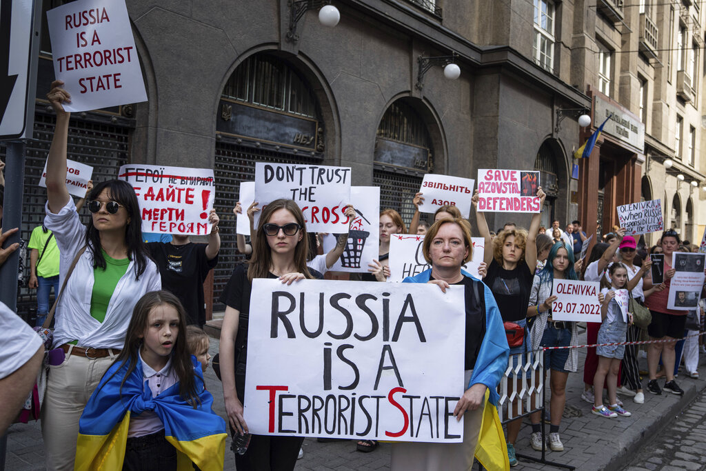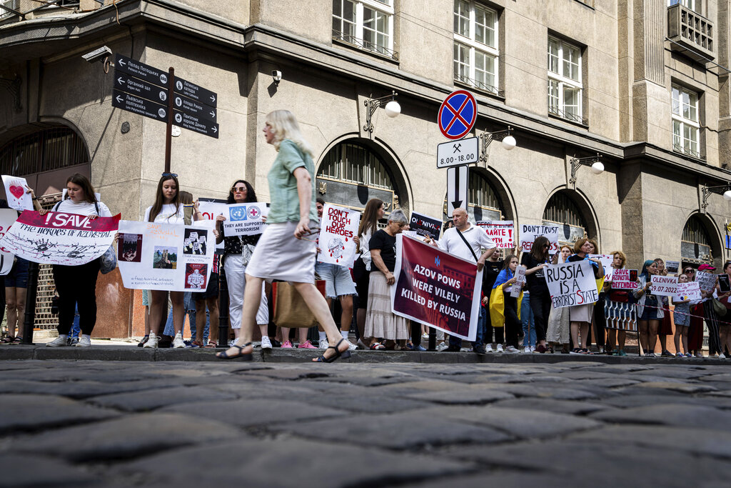 Relatives of soldiers from the Azov Regiment and protesters hold banners against Russia in Lviv, Ukraine, on Thursday, Aug, 18, 2022. A small group of anti-Russian protesters gathered on a street corner along a route where visiting leaders will travel to meet Ukrainian President Volodymyr Zelenskyy. The Ukrainian leader is due to meet United Nations Secretary General Antonio Guterres and Turkish President Recep Tayyip Erdogan in the city which is near Ukraine’s border with Poland. (AP Photo/Evgeniy Maloletka)