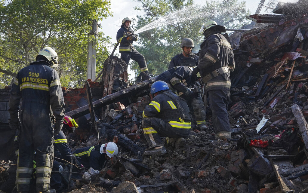 Firefighters dig through the rubble of the building destroyed during a missile strike in Kharkiv, Ukraine, Thursday, Aug. 18, 2022. (AP Photo/Andrii Marienko)