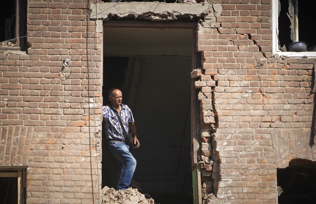 Local resident stands in a building destroyed during a missile strike in Kharkiv, Ukraine, Thursday, Aug. 18, 2022. (AP Photo/Andrii Marienko)