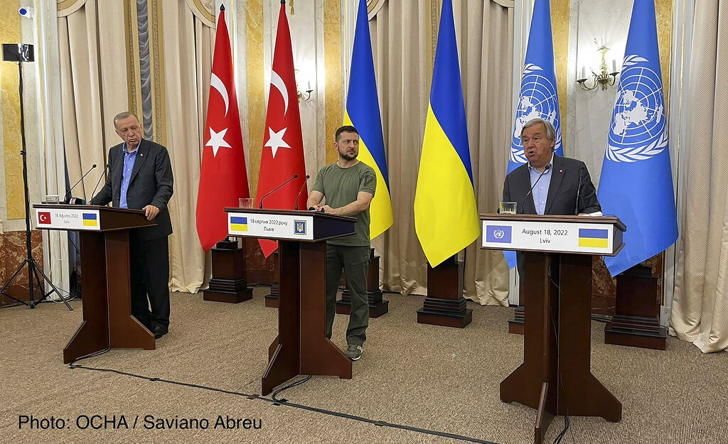 In this photo provided by the United Nations Office for the Coordination of Humanitarian Affairs, Ukrainian President Volodymyr Zelenskyy, center, Turkish President Recep Tayyip Erdogan, left, and United Nations Secretary General Antonio Guterres hold a press conference in Lviv, Ukraine, Thursday, Aug. 18, 2022. (Saviano Abreu, OCHA via AP)