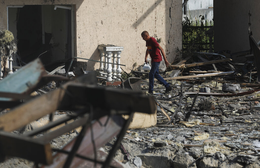 A man passes by buildings of local resort destroyed following recent Russian missile attacks in Odesa region, Ukraine, Thursday, Aug. 18, 2022. (AP Photo/Nina Lyashonok)