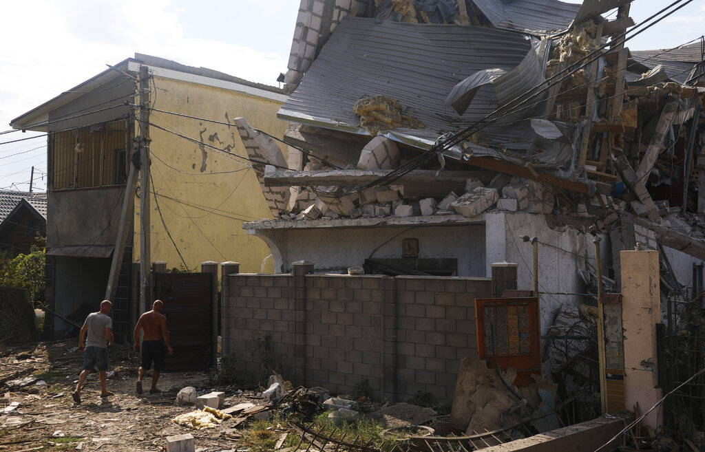Men walk near buildings of local resort destroyed following recent Russian missile attacks in Odesa region, Ukraine, Thursday, Aug. 18, 2022. (AP Photo/Nina Lyashonok)