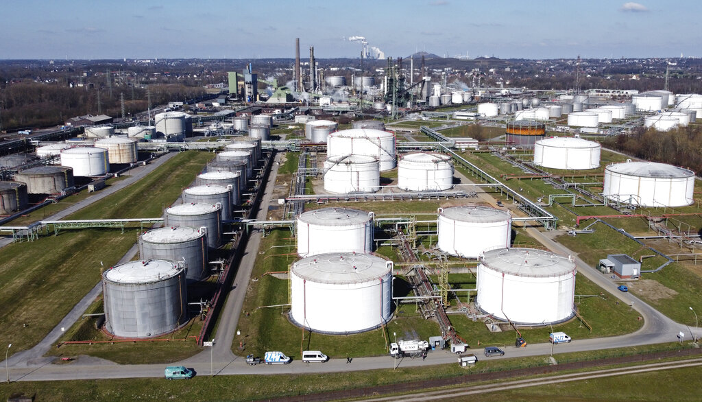 Big tanks are seen at a BP oil refinery in Gelsenkirchen, Germany, Monday, March 7, 2022. Prices for gasoline and diesel reached new highs in Germany due to Russia’s war in Ukraine. (AP Photo/Martin Meissner)