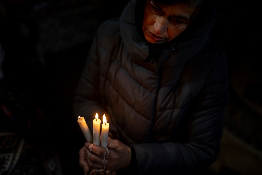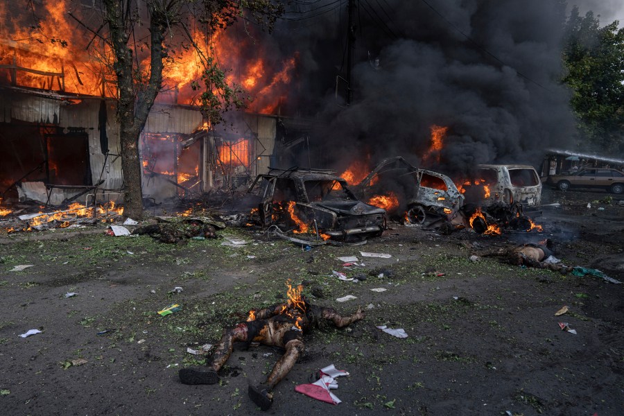 Away from it, bodies littered ruined buildings, forests and roadsides during the war’s second year. Russian barrages repeatedly blasted civilian targets, frequently reducing apartment buildings to rubble, flames and smoke.