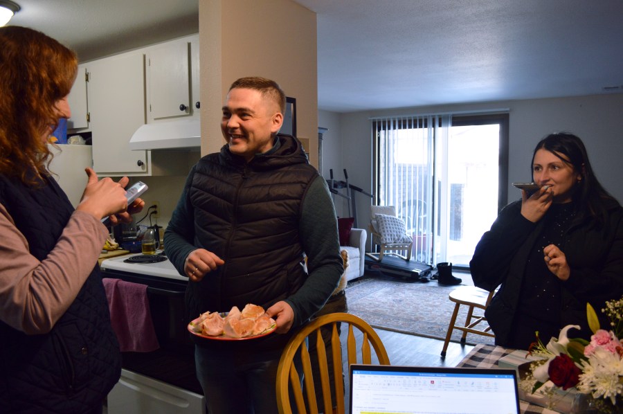 Standing in the dining room of one of the first families to come to the Stoughton Resettlement, Lushaj watches Illia Poroshkov cut the skin off a large piece of fruit.