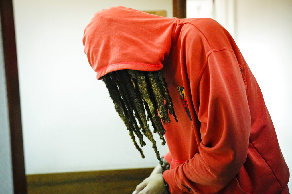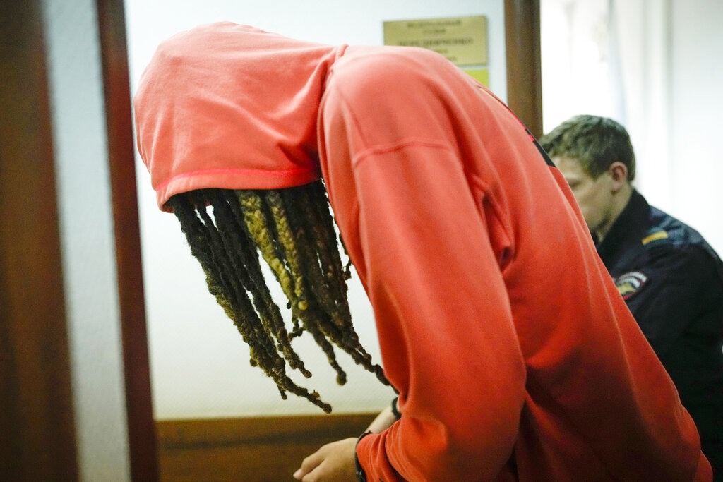 WNBA star and two-time Olympic gold medalist Brittney Griner leaves a courtroom after a hearing, in Khimki just outside Moscow, Russia, Friday, May 13, 2022. Griner, a two-time Olympic gold medalist, was detained at the Moscow airport in February after vape cartridges containing oil derived from cannabis were allegedly found in her luggage, which could carry a maximum penalty of 10 years in prison. (AP Photo/Alexander Zemlianichenko)
