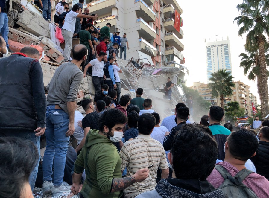 Turkish media showed wreckage of a multiple-story building in central Izmir, with people climbing it to reach rescuers. Smoke was filmed in several spots in central Izmir.