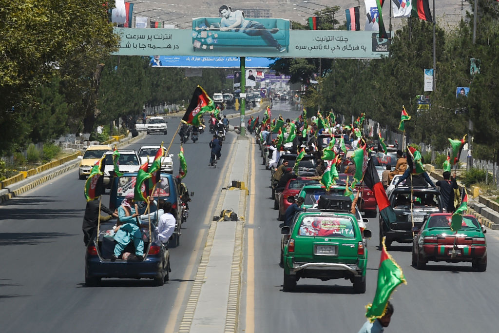 People ride in a convoy waving Afghan national flags along a street to celebrate the 100th anniversary of the country’s Independence Day in Kabul on August 19, 2019. (Photo by Wakil KOHSAR / AFP) (Photo by WAKIL KOHSAR/AFP via Getty Images)