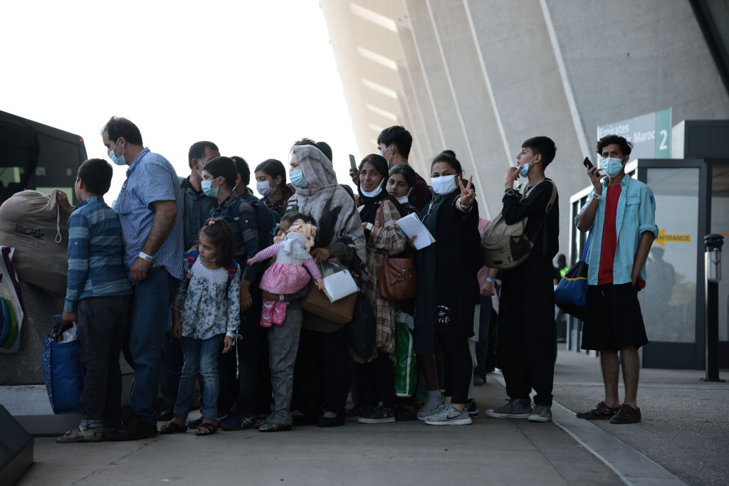 DULLES, VIRGINIA – AUGUST 25: People evacuated from Kabul Afghanistan wait to board a bus that will take them to a refugee processing center at the Dulles International Airport on August 25, 2021 in Dulles, Virginia. According to the U.S. Department of Defense, five evacuation flights from Kabul, Afghanistan have landed at the Dulles Airport carrying 1,200 Afghan refugees in last day. The White House also announced that since August 14, the U.S. has evacuated and facilitated the evacuation of approximately 82,300 people on US military and coalition flights. (Photo by Anna Moneymaker/Getty Images)