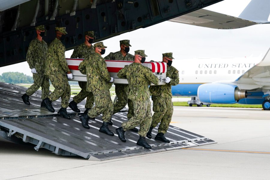 A Navy carry team moves a transfer case containing the remains of Navy Corpsman Maxton W. Soviak, 22, of Berlin Heights, Ohio, Sunday, Aug. 29, 2021, during a casualty return at Dover Air Force Base, Del. According to the Department of Defense, Soviak died in an attack at Afghanistan’s Kabul airport, along with 12 other U.S. service members supporting Operation Freedom’s Sentinel. (AP Photo/Manuel Balce Ceneta)