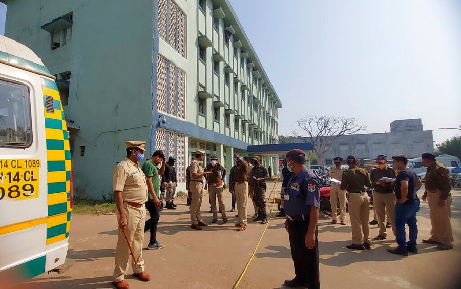 Police officers investigate the scene after a fire broke out at District General Hospital in Bhandara, about 70 kilometres from Nagpur, India, Saturday, Jan. 9, 2021. A fire broke out in the intensive care unit of a government-run hospital in western India early Saturday, killing 10 infants, police and news reports said. Firefighters rescued seven babies from the newborn care unit of the hospital. (AP Photo)