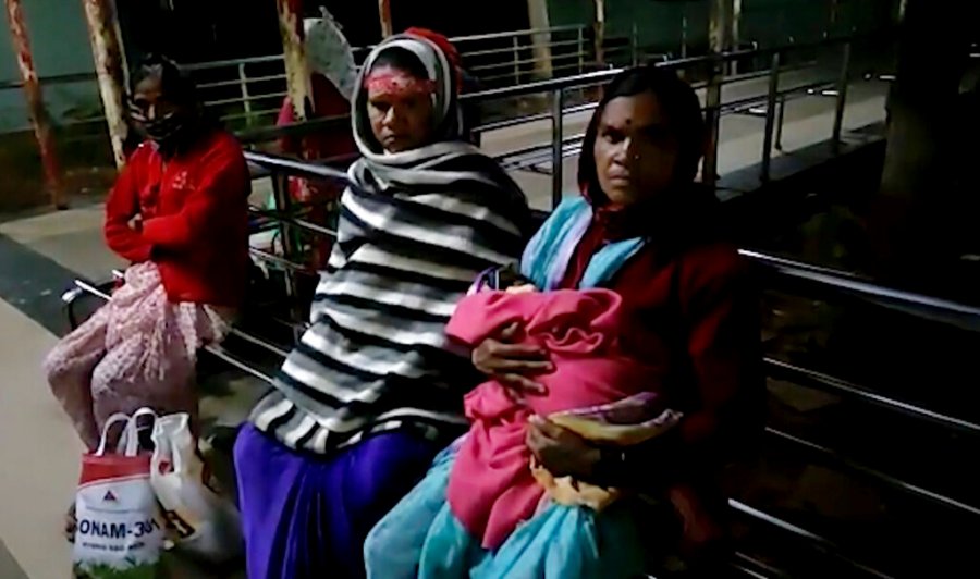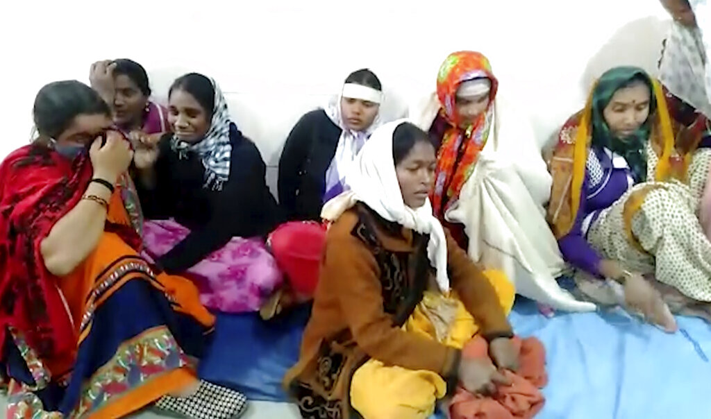 This frame grab from video provided by KK Productions shows women grieving at District General Hospital where a fire broke out in Bhandara, about 70 kilometres from Nagpur, India, Saturday, Jan. 9, 2021. A fire broke out in the intensive care unit of a government-run hospital in western India early Saturday, killing 10 infants, police and news reports said. Firefighters rescued seven babies from the newborn care unit of the hospital. (KK Productions via AP)