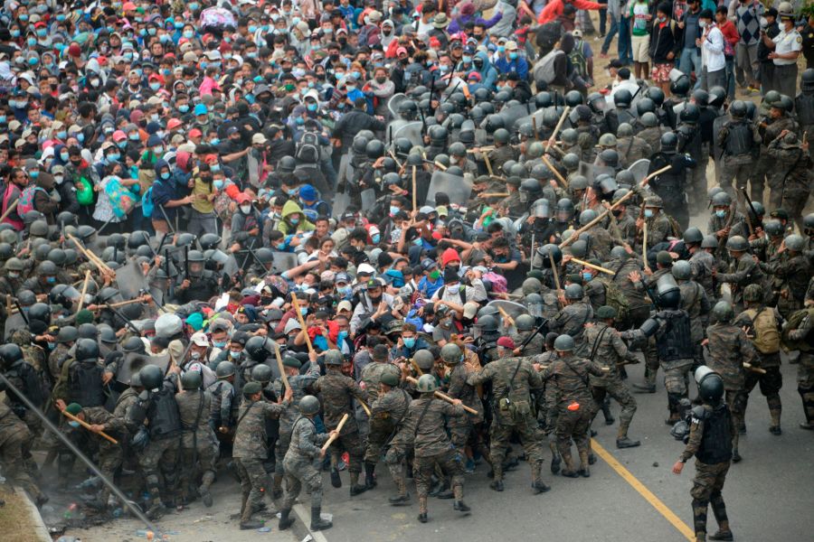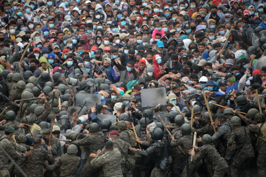 Honduran migrants, part of a caravan heading to the United States, clash with Guatemalan security forces in Vado Hondo, Guatemala on January 17, 2021. – Guatemalan police fired tear gas Sunday to try to disperse a caravan of thousands of migrants heading toward the United States. (Photo by Johan ORDONEZ / AFP) (Photo by JOHAN ORDONEZ/AFP via Getty Images)