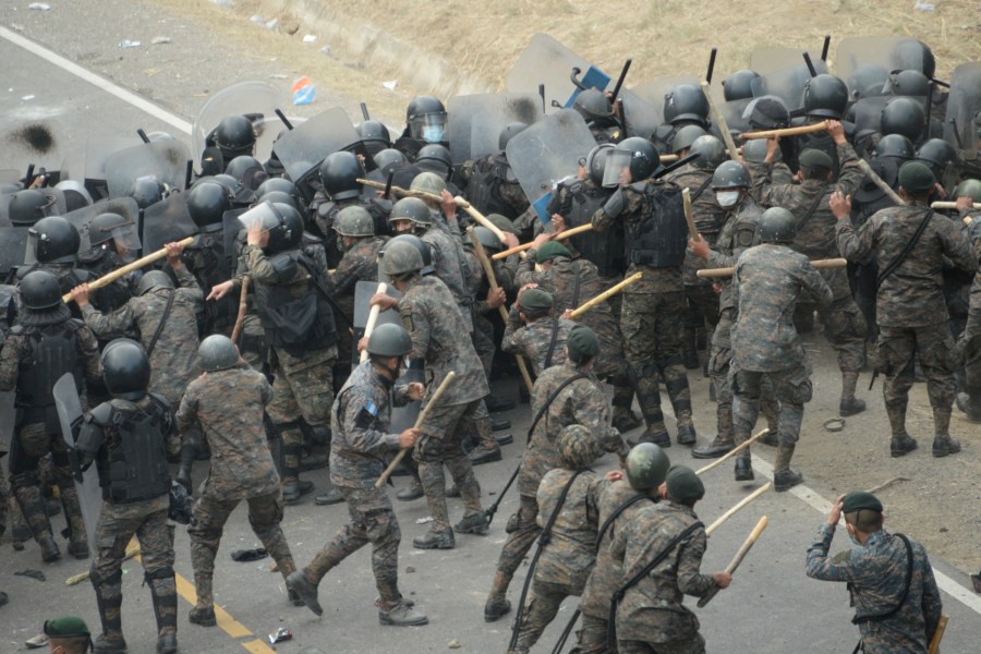 Soldiers of Guatemalan Army block the way to Honduran migrants, part of a caravan heading to the United States, in Vado Hondo, Guatemala on January 17, 2021. – Guatemalan police fired tear gas Sunday to disperse thousands of Honduran migrants trying to make it to the United States on foot, with soldiers beating back a group trying to push through barricades, AFP journalists witnessed. (Photo by Johan ORDONEZ / AFP) (Photo by JOHAN ORDONEZ/AFP via Getty Images)