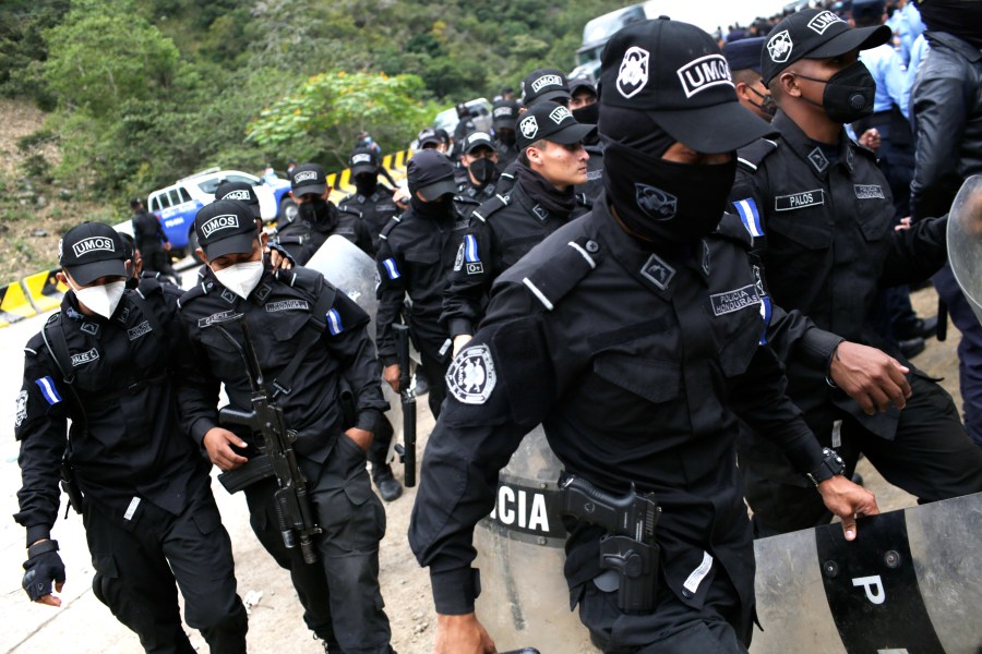 EL FLORIDO, HONDURAS – JANUARY 16: Honduran police officers are deployed in the Honduras-Guatemala border at a checkpoint during the arrival of the migrant caravan on January 16, 2021 in El Florido, Honduras. The caravan departed from Honduras to walk across Guatemala and Mexico to eventually reach the United States. Central Americans expect to receive asylum and most Hondurans decided to migrate after being hit by recent hurricanes Eta and Iota. Honduras recently asked to U.S. to extend their Temporary Protected Status. (Photo by Josue Decavele/Getty Images)